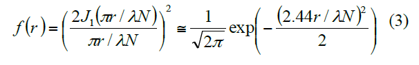 我們正在測(cè)量一個(gè)比距離 D 小的器件寬度。因此,這是一個(gè)亞衍射極限特征。這個(gè)系數(shù)來(lái)自于從點(diǎn)源發(fā)出的能量譜作為距離的函數(shù)。圖6中的艾里盤確定了能量譜在貝塞爾函數(shù)輪廓中為零的距離極限,這是以點(diǎn)源為中心的距離函數(shù) [9]。這個(gè)能量輪廓在艾里盤內(nèi)可以用高斯輪廓近似擬合,其系數(shù)為 2.44,這便于進(jìn)一步的數(shù)學(xué)處理。從點(diǎn)源沿距離的能量譜可以描述為: